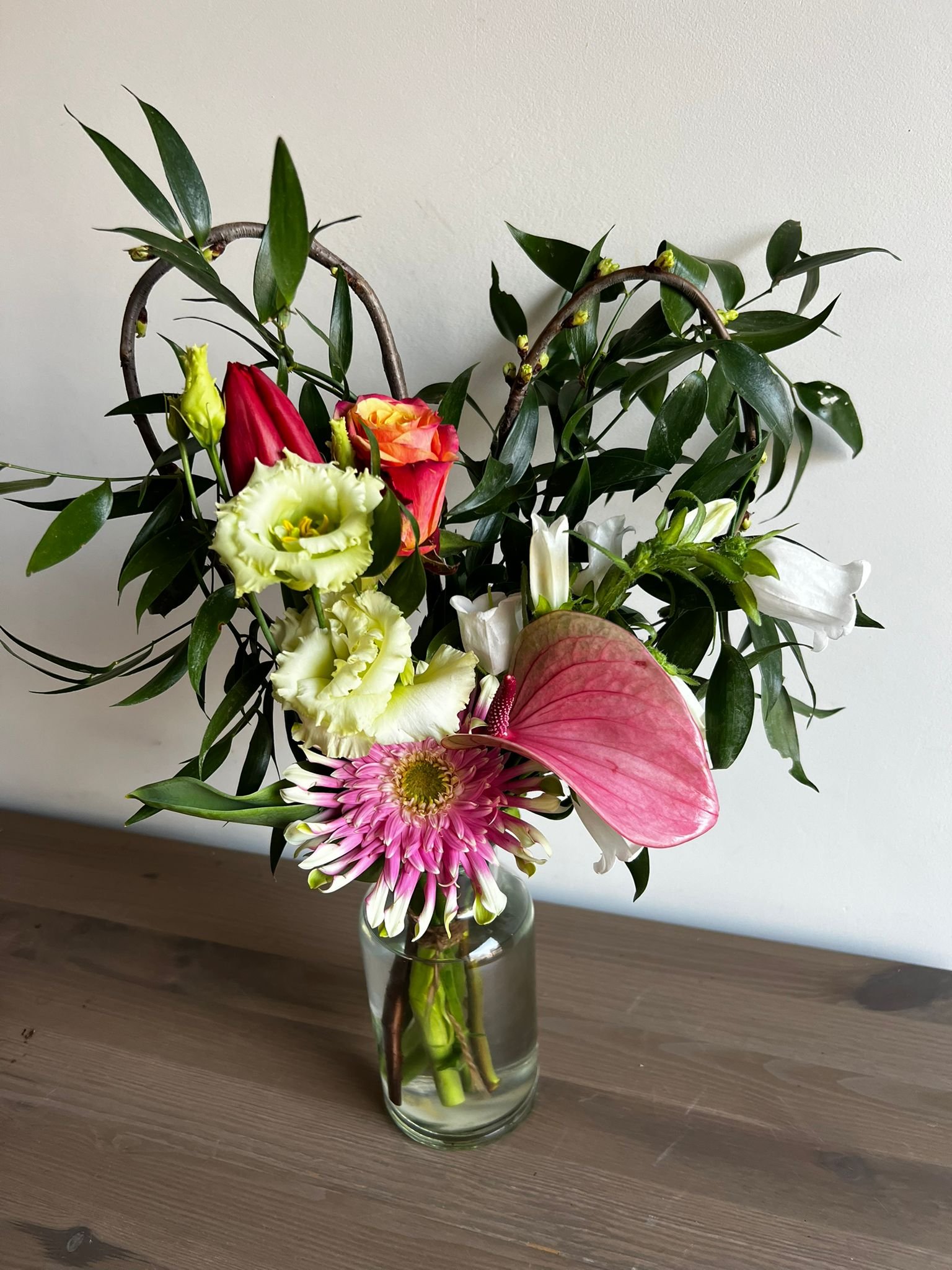 Een stijlvol Valentijnsboeket in hartvorm met roze en witte bloemen, inclusief vaas. Het perfecte romantische cadeau om jouw liefde te verrassen op Valentijnsdag.